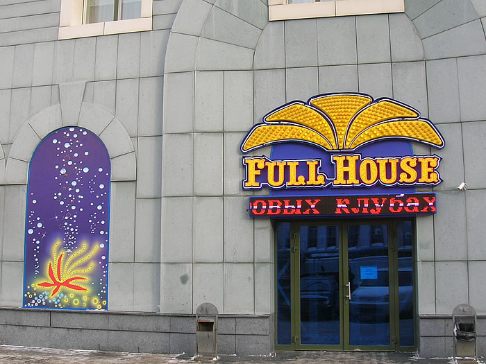 Буквы: «Full house» — объемные несветовые буквы с пущенными по верху светодиодами желтого цвета (светодиоды мигают попеременно). Сами буквы смонтированы в объемный открытый короб (глубина 40 мм), по контуру буквы подсвечены голубым неоном.