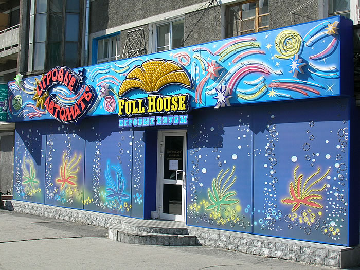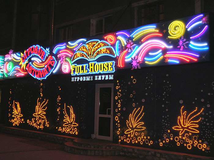 Буквы «Full house» — объемные несветовые буквы с пущенными по верху светодиодами желтого цвета (светодиоды мигают попеременно). Сами буквы смонтированы в объемный открытый короб (глубина 40 мм), по контуру буквы подсвечены голубым неоном.