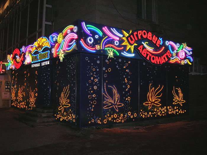 Буквы «Игровые Автоматы» — объемные световые буквы, лицевая часть — акрил, зафонованный траслюцентной пленкой Oracal. Сами буквы смонтированы в объемный открытый короб (глубина 40 мм).