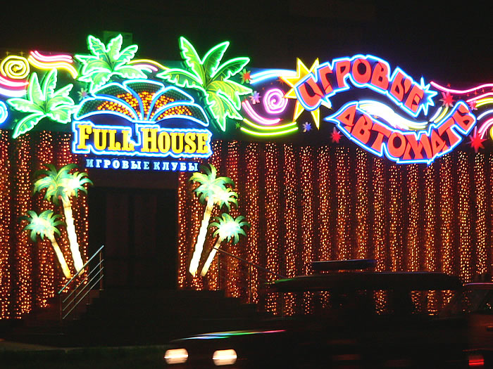 Буквы «Full house» — объемные несветовые буквы с пущенными по верху светодиодами желтого цвета (светодиоды мигают попеременно). Сами буквы смонтированы в объемный открытый короб (глубина 40 мм), по контуру буквы подсвечены голубым неоном.