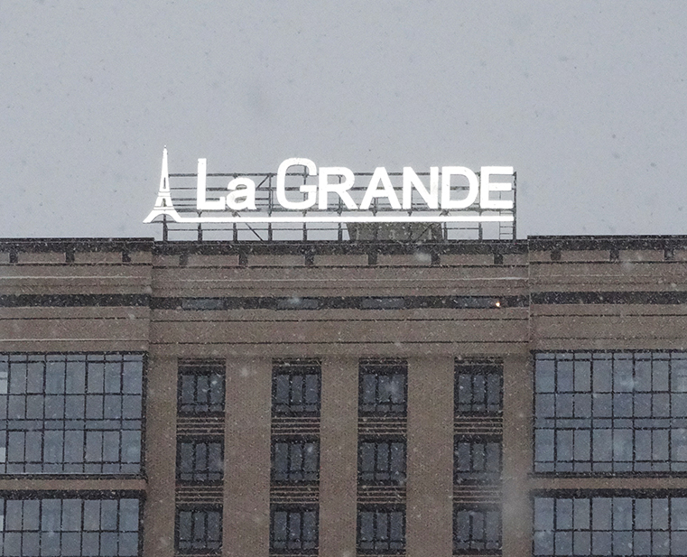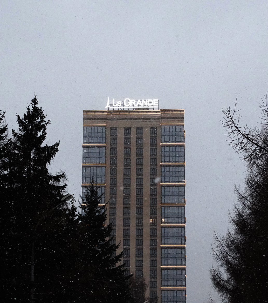 ЖК «La Grande». Производство и монтаж крышной установки - металлические открытые буквы с полимерным покрытием с использованием пиксельных светодиодных панелей. Дата выполнения работы: декабрь 2015.