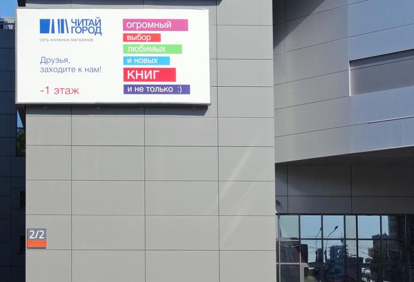 Сеть книжных магазинов «Читай-город». Изготовление и монтаж крышной установки из объемных букв, а также наружной и внутренних вывесок. Дата выполнения работы: март 2016.